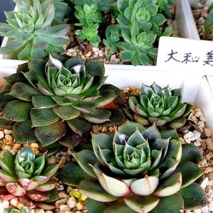 【エケベリア属 大和美尼】 Echeveria 'Yamato-bini' Echeveria 'Yamato-mini' 大和錦×ミニマの交配種 大和錦特有のダークグリーン💚 葉のフチや爪先は赤❤️ 葉裏もうっすらと赤の筋❤️ 秋~冬は外側の葉から赤く色づき、 葉が締まる事でコロンとした 丸いフォルムになります(*‘ω‘ *) 去年の3月に旅先の香川県高松市の 西村ジョイさんで購入した苗を、 信楽で買ったマメ鉢に植え替え 大概お気に入りの鉢に植えると 枯らしてしまう事が多々なのですが、 殆ど放置で未だ健在なのが嬉しい 日本が誇るハイブリター 根岸利和氏の交配です