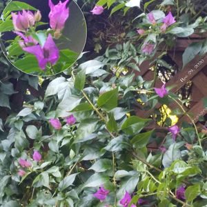 ブ-ゲンビリア: 柵に絡ませています。 昨年から急成長してどんどん伸びています。 切っても切っても伸びます。 新芽からしか花が咲かないと聞いてどこを切っていいのか迷いながらカットしています。密集しすぎて中の花が枯れだしたので悩み中です。