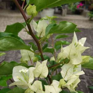 今年二回目の開花 真っ白なブ―ゲンビリアは初です。 まだ小さい、高さ30センチほど、、 南国気分🌴🌺🌴🌺☺️