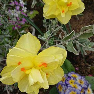 寄せ植えの勿忘草が綺麗です 八重咲水仙今年買った物は肥料不足か小さな花です 八重咲き水仙は種類が沢山ありビックリしました 家には3種類有ります❣️