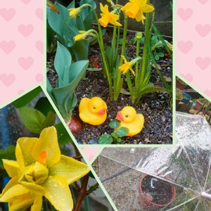 こんにちは🌧 今年福袋に入っていた小さな水仙のお花が咲きました雨🌧に負けない様にアヒル🐥さんが見守ります‼️ 八重咲き水仙のお花はやっと咲きそうなので傘☂をかけました🤭 傘☂飛ばない様に結束バンドで時計草の枝や他の枝に固定しています🤭