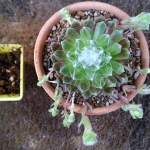 三日程前に100均で購入したセンぺルビウムさんを植え替えました。 お子様がたくさんついていて大きくてお買い得でした。🎶 糸🕸がたくさん張り巡らされていて、不思議な植物だわぁ…🌹 センペルさんも名前の特定が難しいと聞きましたが、もしも解れば嬉しいです。✴ 巻絹イワレンゲかな⁉️