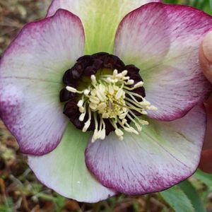 こんばんは😃🌃 今日は、暖かい♨️☀️ 1日でしたね。 クリスマスローズ お気に入りのが 咲きました。 下を向いているので 片手で、押さえて なんとか、撮りました🎵