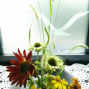 今日は青空が見えると 喜んでいたら… 午後からゲリラ豪雨… 風雨で傷んでしまった ヒマワリやエキナセアを エノコログサと一緒に いけました
