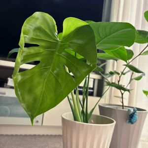 今年の3月に購入したモンステラ2号🪴秋までベランダで育てたら、初めて切り込みが入った葉っぱが2枚出てきた。