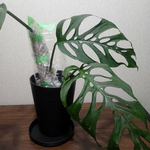 モンステラ アダンソニー 3月5日(水)にお迎えしました🗓️ 前回の投稿が6月26日(木)📅 現在葉っぱの数は6枚ですが 切れてる葉っぱの数は3枚と順調のようです~😃 梅雨明け頃に支柱を付けました😵 今では葉っぱも大きくなって😵💦支柱を取り除くことは難しいようです~😃