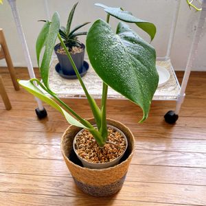 モンステラ1号(左)と2号(右)🪴2号はアダンソニー、ダイソーで購入した1号の品種は不明。切り込みが入った2号の方がちょっと大きいかも?色違いの鉢カバーに入れてあげた。