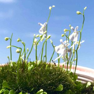 おはようございます! 陽射しがなくていつもより過ごしやすい朝ですが、湿気は高いですね(@_@。 今日は食虫植物が花を咲かせました! 名前とは裏腹に白くてかわゆい花でした。 朝からいろんな植物にたっぷり水浴びさせました。でもでもムレが心配!晴れるならカラッと晴れて欲しいな。