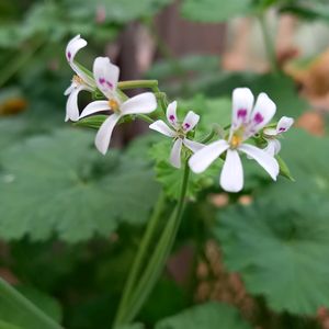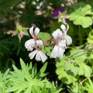 アップルゼラニウム/白花匂天竺葵 ちぢれた葉にリンゴの香り🍃 センテッドゼラニウム(ニオイゼラニウム)の一種です♪ 2枚の花びらに赤紫の筋模様、5裂した雌しべ(見にくいですが💦)…小花の可愛さに一目惚れです♡ ニオイゼラニウムを色々育ててみたくなりました🪴 雄性先熟🌱南アフリカ原産🌿