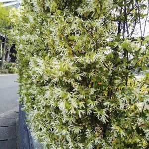シロバナトキワマンサク 満開のトキワマンサク。 密集して、花が咲いている。 生け垣造りだね。 高さ、2m程。 トキワマンサクはベニバナが多いね。