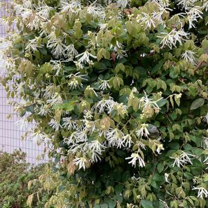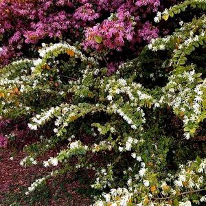 シロバナトキワマンサク(白花常磐万作) 「とても丈夫な花木で、条件を満たせば剪定以外はほぼ放任で育ちます。 日当たりの良い、肥沃で水はけの良い土の場所を好みますが、半日陰でも育ちます。 暗くなりがちなバックヤードに使用しても、明るい緑色の葉は庭に明るさと爽やかさをもたらしてくれます」とのこと📙 お散歩中に通った公園のフェンスの雰囲気がステキでした🤍💚🌿 実は、我が家の北側の生垣も植えられて30年ほど経ち、樹勢が落ち、全体に透けが目立つようになってきているので、散歩中に元気いっぱいの生垣を見ると興味深く観察してしまいます🔍 生垣の木もまだがんばって生きているから寂しくなってきた隙間に植えられたらいいのになぁと思ってしまいます😌💇♀️