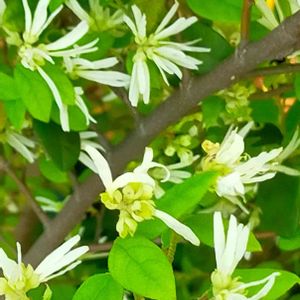 「シロバナトキワマンサク(白花常盤満作)」✨🤍 白花、初めて見ました🎶 花数が少なかったので観察できましたが、 おもちゃの吹き戻しのように、 くるくるっと丸まっているんですね😊 マンサク科トキワマンサク属 花言葉 :「不思議な力」「神聖な」