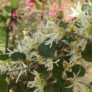 シロバナトキワマンサク(白花常磐万作) マンサク科 4月8日に投稿したベニバナトキワマンサク💕白花もありましたよ🤍 シロバナトキワマンサクの葉色は明るい緑色💚 お花は細長い4枚の白い花弁🤍 とても清楚で清涼感あふれるお花ですネ🤍