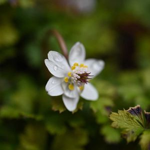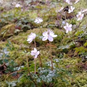【バイカオウレン(梅花黄蓮)】 日本原産、キンポウゲ科多年草 東北南部から四国に分布し、山林内の湿った場所を好み、ウメに似た形の白い花を咲かせる。 新しい葉が出るのに先駆けて、花茎を伸ばしてその先端に1輪づつ咲く。 花径は1.5cmほどで、5枚の白い花びらと中心から飛び出したしべ類が印象的。白い花弁に見えるのはがく片で、黄色のスプーン状の部分が本来の花弁。 花の形がウメの花に似て、オウレンの仲間なので、梅花オウレンの名前がつく。 牧野富太郎博士がこよなく愛した花として有名。 草丈:3~10cm、 開花期:2月~3月 花色:白 白野江植物公園@北九州市門司区