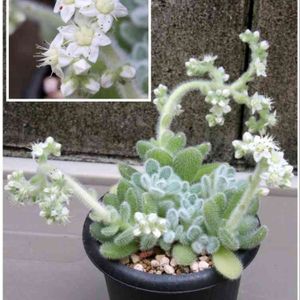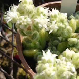 セダム属には珍しく毛むくじゃら セダム属には珍しく白い花 噂では臭いと言うけれど、まだ沢山咲いてないので感じません😅