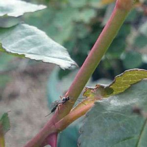 こんにちは✨ うちのバラは土にまくオルトラン意外は無農薬なのでけっこう虫がいます(*^_^*) ホオジロが虫を食べにきたりトカゲやクモも頑張って夏にはスズメバチがきたり✨ それでも目についた害虫はテデトールするんですがこの虫は観察してても分からない~(*_*) 7ミリくらいの虫なんですが誰か分かる人いますか~? 産卵管がみえるのでハバチか寄生バチだと思うんですが…