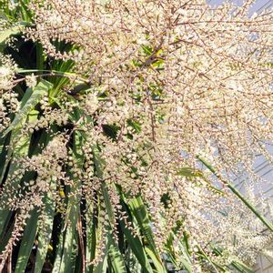 ご近所様の庭の高さ3メートルくらいの南国風の木🌴に、芳香剤のような匂いの花が咲いていた。 蘭のようで蘭じゃない シュロのようでシュロじゃない それはなにかと尋ねたら 「ニオイシュロランだよ♪」 まんまじゃん🤣