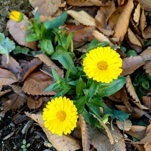 冬知らず カレンデュラ・アルベンシス ①②1週間前に伸びすぎてカットしたお花がもったいなくてコップに水差ししているもの、天気の良い日に開閉しながらまだよく咲いています🌼 ③11月24日に植え付けお花、今日の様子。コップに差したお花も並べて外に出しっぱなしです😄