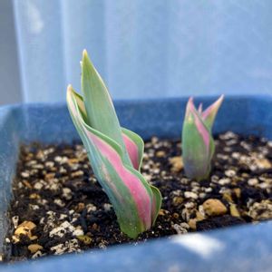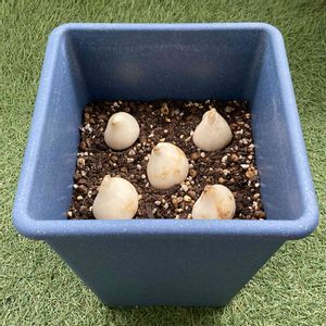夕方になって涼しくなったので、もう一鉢仕込みました🧄 ピンクと白の斑入り葉のチューリップ🌷 とても楽しみです😊