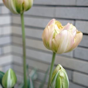 【1枚目】【2枚目】班入り葉のチューリップ・ハッピーアップスターが一気に咲いてきましたが、昨日の雨嵐で花の中に雨が入ってしまったので、おそらく傷んでいて長くは保たないかも😢 玄関内に取り込まなかったのが悔やまれます😣 でもとっても綺麗に咲いてます🥹 【3枚目】遡って、4月8日の様子。 【4枚目】さらに1日遡って、開き始めた4月7日の様子。花が開いてくるとそれほど目立ちませんが、咲き始めは伸びた班入りシルバーリーフの魅力が際立っています🥰 【5枚目】花は左上→右上→下段の順に咲き進み、蕾のグリーン✕白→クリーム色→クリームイエローと変化し、最終的にアプリコットピンク✕クリームイエローへと変化していきました。このアプリコットピンク色の部分はマンゴーチャームのお色に近いかも。なんとも美味しそうなお色で、大好きなカラーです🥰💕💕 数えたら12本咲いていた。12球植えたから全部出たのかも😆👍 さて、あと何日保つかしら?🤔