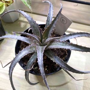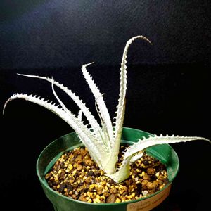 ■ディッキア マルニエルラポストレイ ‘グランマルニエ‘ 週中プラントハントの旅、収穫報告、ヤフオク編🎅 外出しておりませんので、本文自粛しなくてすみます。 迂闊に買い物に出掛けられないため、ヤフオクの花宇宙さんの出品を見ておりましたら「なんということでしょう」、と劇的ビフォーアフターばりに感動してしまい、ついポチっと。 白のプラ鉢で今朝届いたので、早速植え替え完了です。狂暴なので分厚い手袋をしてやりましたが、葉がうねうねしてるので、植え替え、めちゃくちゃ難しいですね。ちゃんと土が隙間なく入ったか心配です😟 ディッキアは興味ないの一点張りはまだ貫くつもりですが、気づけば我が家にもう5株目です。 (メモ) ・ディッキア 姫剣山 ・ディッキア イエローグロー ・ディッキア ガーネットクロウ ・ディッキア コリスタミネア ・ディッキア マルニエルラポストレイ ‘グランマルニエ‘ 最高気温15℃、最低気温6℃