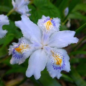 シャガ(射干、著莪)が咲いていました。 アヤメ科で、白地🤍に青い🔹🔹斑点が入る花をたくさん咲かせています💕🎶 花色は白と薄青の2色あるようですが、薄青の花は見たことがありません😥 珍しいのでしょうか😊