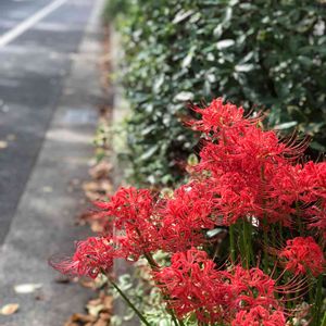 家の前、桜並木の根元に彼岸花が。