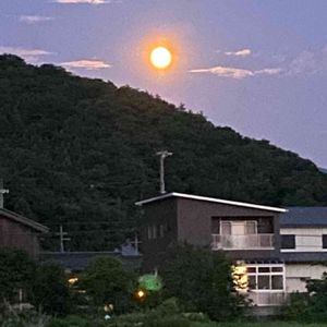 朝日と勘違いしそうな月(7時40分)スマホ撮り…西側まだ夕焼けが少し残り🙌