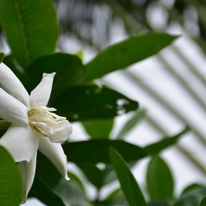 今日のお花。 こちらのクチナシは八重かな。 バックは旅人の木。🌴