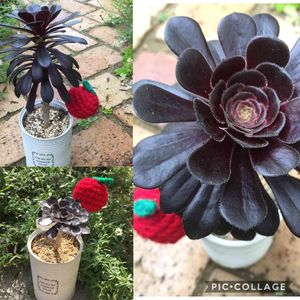 昨年クリスタルさんにいただいた、素敵リメ鉢&編み編みリンゴちゃん🍎✨ 毎年盆正月に長期不在する私でも鉢で育てられる多肉ちゃんを尋ね、冬型(夏に休眠するので水やり不要)の黒法師さんを教えていただきました☺️ おかげさまで多肉枯らし名人の私のもとでも元気に育っています👏 上から見るとまばゆいほど美しい姿ですが、黒法師さん、もしかして徒長気味?💦 昨年9月(左下)にお迎えした時はギュッとしてたのに、なんだか葉の間が伸びてきました。 陽当たりがあまりよくないからかしら😢