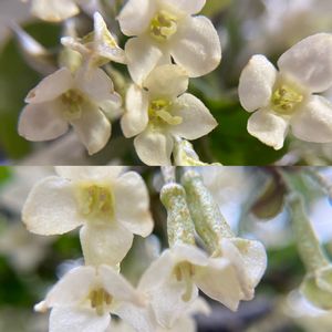 夏茱萸(ナツグミと思うw ^^; 左) 白花長寿梅(シロバナチョウジュバイ 右) ナツグミも咲き始めました 分かりにくくてすみません^^;