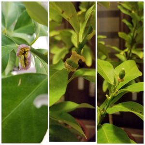 教えてください😣 アレンユーレカレモンの果実が順調についてきてますが、一部2つか3つの花がくっついてしまい(写真左)、花びらが取れたあとから真ん中の写真のようになっています。 これはそのままにしておいていいのか、他の果実の体力のことを考えて摘果した方がいいのか分からないです。 写真3は綺麗な形で順調に育ってるレモンの一部です。