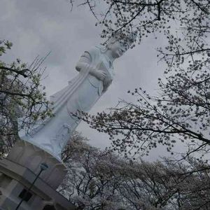 観音様と桜🌸 平日だけれども混雑していました。 船岡城趾公園
