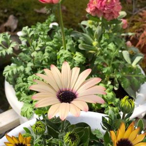 3ヶ月前にチョコレートコスモスやサルビアと寄せ植えにしたオステオスペルマムです。 秋はあまりお花が咲かなかったのですが、株はどんどん育って今は葉っぱこんもりに♪ 蕾もたくさんでひとつふたつと開いてきました(*,,˃ ᵕ ˂ )♬.*゚ 寒いけどこのまま咲いてくれるのかなー? …𖡼.𖤣𖥧𖡼.𖤣𖥧⚘……… ஐ オステオスペルマムパティエ(ベリーズパフェ) ஐ オレアリアアフィン ஐ アイビー