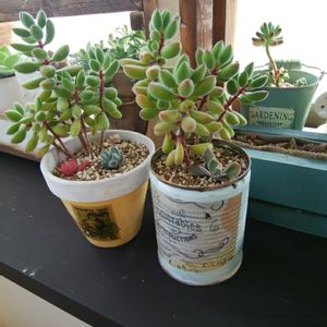 朝からリメイク鉢とリメイク缶をせっせせっせと作り… パンパンになっていたロゲルシーさんを株分けしました♡ ロゲルシーさんは3年目にして初めての植え替えです♪ プクプクパンパンになってくれてうれしいです(^^*) 足下ががらんとしてるので 子苗さんを配置☆ 大きくなあれ(*^^*)