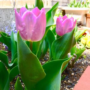 🌿🌷チューリップ ミストレスミスティック🌷🌿 ラベンダーモーブにチェリーピンクのラインが入った富山産のチューリップ🌷 咲き始めは『なんだかパッとしない色ねー』と思いましたが、だんだん色合いが魅力的になり存在感が増しました💜💗💚 2022.4.12撮影