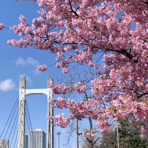 おはようございます☁️ 木場公園大橋をバックに桜を撮りました🌸🌸🌸 橋の右側にはスカイツリーが見えますが残念ながらサクラと一緒には撮れません。 この時期の嬉しい光景です😊💕 日曜日pic