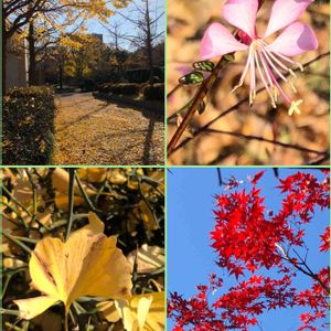 ちょっとだけのぞいた植物園に 素敵な色合いが❣️ イチョウ、木も道も黄色! 落ち葉がカラタチのトゲに刺さってユラユラ! 薄ピンクのガウラもユラユラ! 青い空をバックにモミジが真っ赤❣️ お花は少ないけど満足です!
