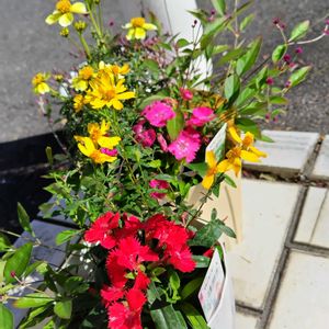 ①出来上がった寄せ植え鉢がホームセンターで半額になっていたので、2鉢お買い上げ😄 ②お天気が良かったので、室内組さんも日向ぼっこ☀️☀️ ③3つの鉢に少しずつ咲いていたクリサンセマムを一鉢にまとめました❇️🧡💛💗❇️