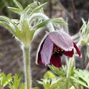 オキナグサ(翁草) キンポウゲ科 オキナグサ属 種から育てて3年でお花が咲き今年で4年めです。 短い毛で覆われた赤紫色の お花が下向きに咲いている 姿はとても情緒があり 大好きです。