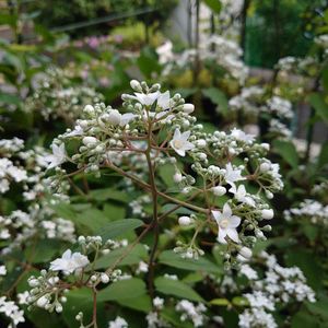 35年目に入ったニュー・ドーンの根本に植えた、アジサイ科ウツギ属の「シセンウツギ」が、一斉に咲き始めた。すぐ近くに、アジサイの「ダンスパーティー」がある。 シセンウツギは、とても小さな星のような花で、とても愛らしい。落葉低木で、我が家では1.5mぐらいで育てている。