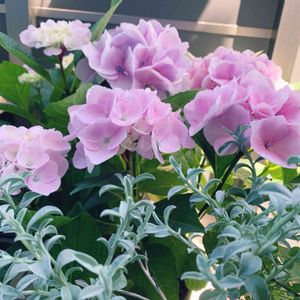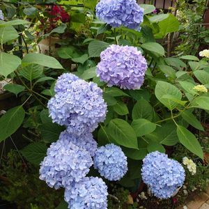 2021年6月2日(水)、曇りのち晴れ。 アジサイ「霧島の恵み」が満開になりました。我が家に迎えたときは、高さ15センチの苗木でしたが、今はカットしても130cm前後あります。 とても美しい空色です。バラにはない色なので、バラをほとんど剪定したあとですが、光り輝いています。 ダンスパーティーも同じくらい成長し、今は青みがかったピンク色に輝いています。 ほぼつるバラは、剪定しました。その中で四季咲きのバラについては、ツボミをつけているのでら、次に咲くのを待っているところです。