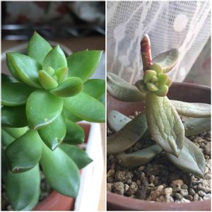 左はまだ先っぽがあった時の画像 年末にうっかり折ってしまいました(/ _ ; ) 右は現在、折れた先っぽは根っこが出ずにそのまましおれてしまいましたが、茎から新芽が出てきました✨ ほんのり色づいてて可愛い(*´ω`*) でもすぐ下の葉っぱがシワシワで折れ曲がってるのが気になる…