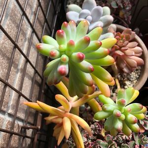 ひとつ110円の多肉が可愛くて、つい購入しちゃいました。すべて名無しさんです。 名前をAIでも調べてみたのですが、あまり自信がなくて💦 AIでは、左上から、虹の玉 レディジア 左下から七福神 銘月 夕映え が候補に出ました。 虹の玉、銘月は納得。あとは半信半疑でおります。皆さまのお力をお借りしたいです。もしかしてこれかな?というご意見をお聞きしたいです。 よろしくお願いいたします🙏