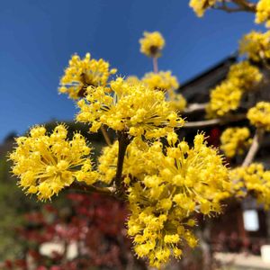 サンシュユ 青空に映えて黄色が輝いてました✨ 埼玉県秩父の光明寺にて。
