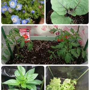 家庭菜園の野菜達。 トマトとピーマンは実をつけ順調に大きくなってます😀 中玉のわき芽も成長中🌱 ナスは小さい実が2つなってました。 サニーレタスも成長してて適宜料理に使ってます🥰 ネモフィラは種が熟してきてて開いてるとこから種を採取してます。