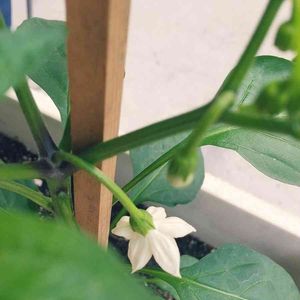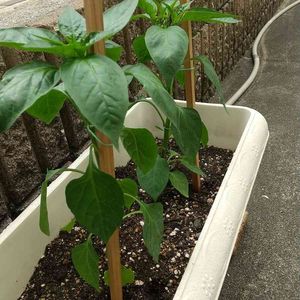 プランター栽培のピーマン、 一番花からいくつか摘花 した方がいいとあったので その前に。 白くて可愛い花です❣️ 今のところ、右の株は 3本仕立てに すると良さそうです。 他にもたくさん小さなつぼみが ついているので4つほど 摘んでみました。
