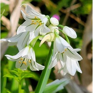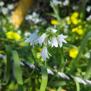 "キュートな金曜日" 散策路沿いの道端で、清楚なお花に出会いました。 調べるとアリウム・トリケトラム(和名ミツカドネギ)と判明。 キュートなお花との二度目の出会いに胸がトキメキました。 📷️ 2025.4.9 ヒガンバナ科アリウム属の多年草(球根植物)。 性質は強健。繁殖力が旺盛で、一度植えると分球のほか種でも増え、次第に広がる。 三角葱(ミツカドネギ)の和名は、茎の切り口が三角形であることにちなむ。 花・葉・球根は食用にでき、ヨーロッパではハーブとして利用されている。