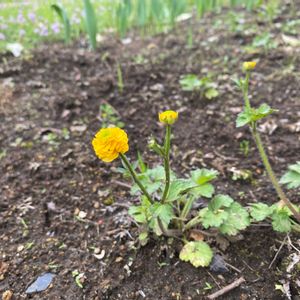 ラナンキュラス ゴールドコイン✨ 昨年お迎えしてほかのお花に押されてましたが、地植えのビオラの間からちょこんと顔を出してます👀 ゴールドコインというだけあって小さくて丸くてピカピカしてます🌟
