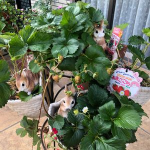 孫のために作ったイチゴ狩りコーナー🍓 でも、実がなかなかならなくて😂昨日はスーパーで買って来たイチゴを葉っぱの上にそっとのせておきました😆